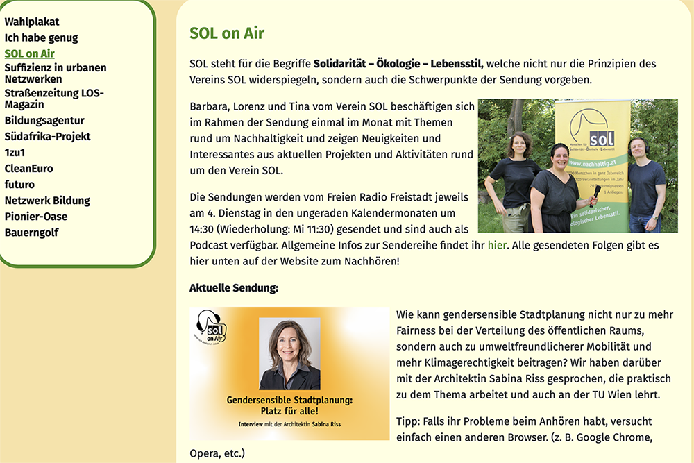 Verein SOL – Menschen für Solidarität, Ökologie und Lebensstil – für nachhaltige Entwicklung und Nachhaltigkeitswissen. Sendereihe mit monatlicher Sendung zu Nachhaltigkeitswissen